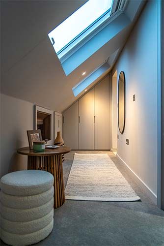 A marvellous attic conversion project in which we have created a complete living space encompassing bedroom, bathroom, hallway and storage space with natural sky light spread all across.